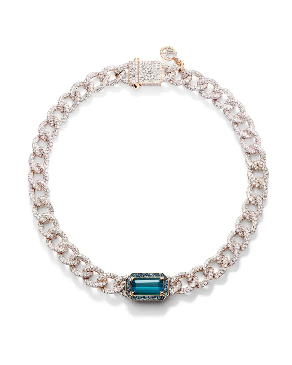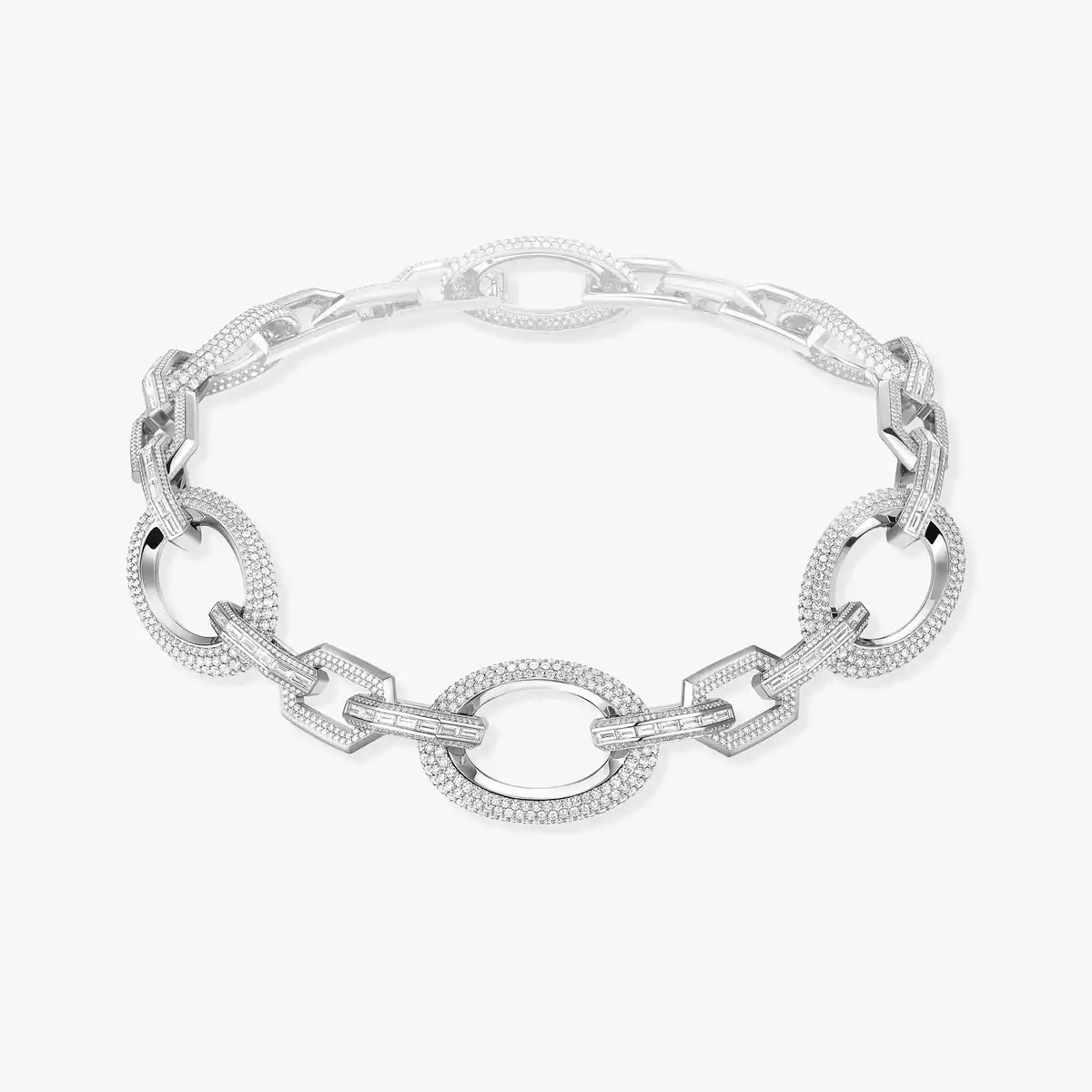 Groove choker 228 000 €. Огромная цепочка и мощные объёмы, бриллиантовое ожерелье Groove из белого золота излучает сияние. Впервые представлено на показе мод Messika, это ожерелья High Jewelry сочетает смелый дизайн с исключительным мастерством. Чередующиеся бриллианты с яркой и багетной огранкой, в сочетании с контрастом чувственных изгибов и уверенных линий, придают изделию современную и графическую ауру.