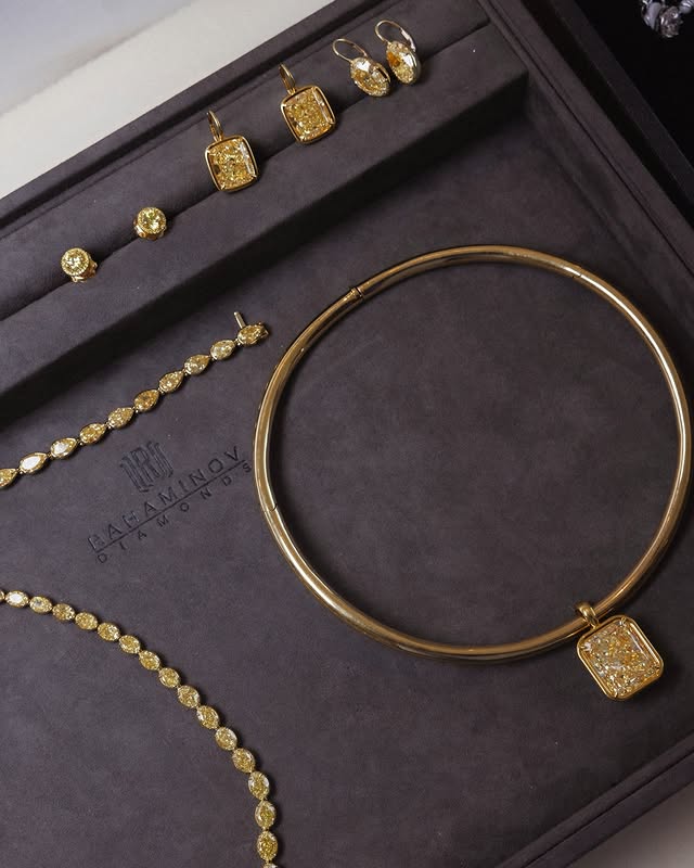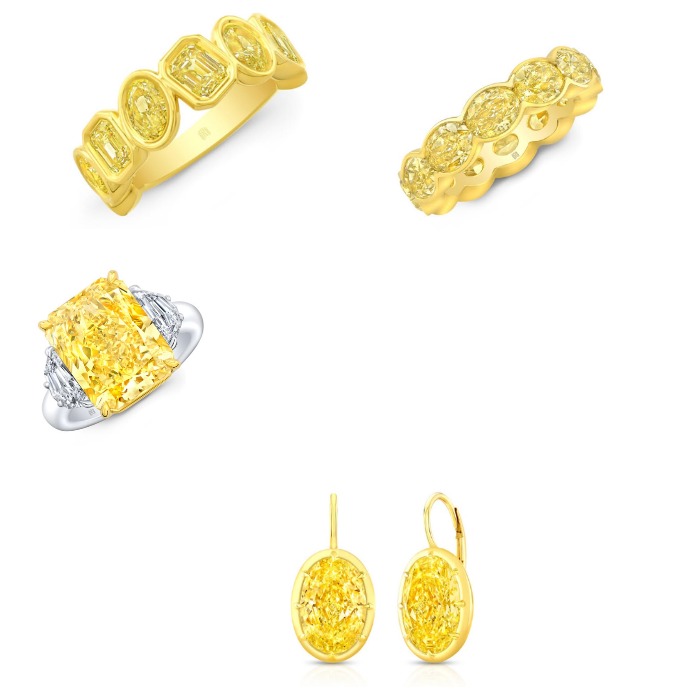 Серьги с жёлтыми бриллиантами из 18-каратного жёлтого золота, кольцо вечности с восточно-западной рамкой с жёлтыми овальными бриллиантами, смешанное жёлтым бриллиантовым кольцом и 10,01-каратное изящное жёлтое бриллиантовое кольцо, обрамлённое двумя белыми бриллиантами с огранкой Cadillac.