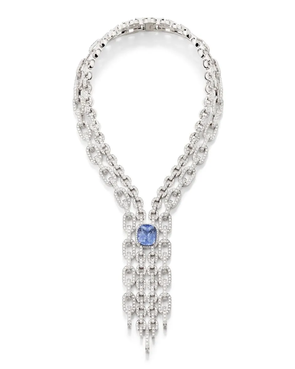 Philippine Leroy-Beaulieu в ожерелье «Blue Chain Cascade» из коллекции ювелирных изделий Pomellato 2025 года «Collezione 1967» из 18-каратного белого золота с потрясающим сапфиром с огранкой 22 карата, окружённым 1 241 бриллиантами - мастерство и скульптурная элегантность дома Pomellato.