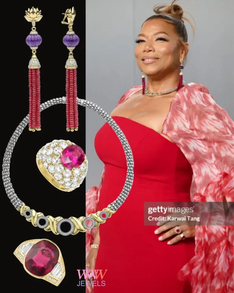 Queen Latifah в многослойных украшениях LAGOS SML High Jewelry и Fizz, достойных королевы. Серьги в виде кисточек из резных аметистовых бусинок с бриллиантовыми акцентами и рубиновыми бусинами.