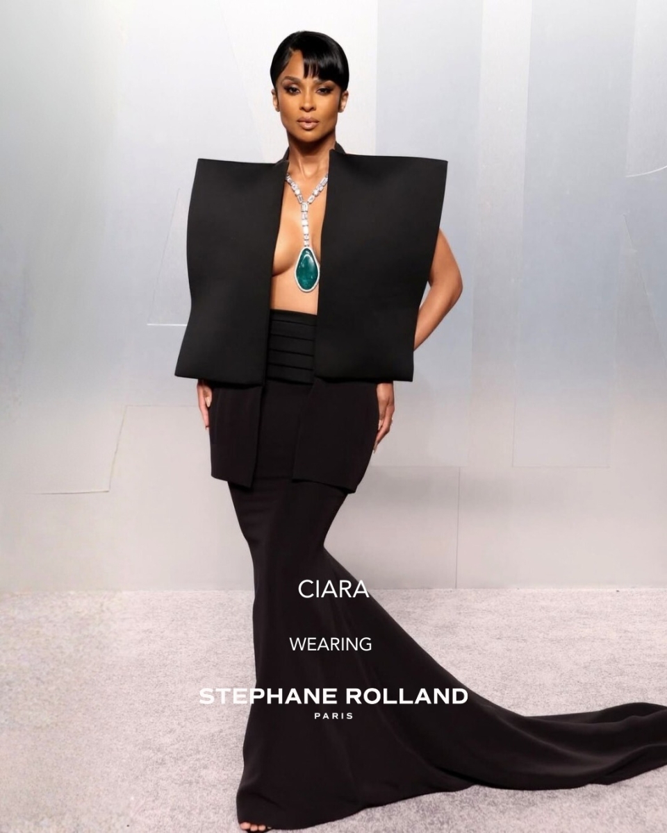 Великолепная Ciara на Vanity Fair 2026 в длинном платье от Stephane Rolland Haute Couture, дополненном бриллиантовым колье с изумрудным кабошоном из ювелирной коллекции Stephane Rolland Jewelry Collection.