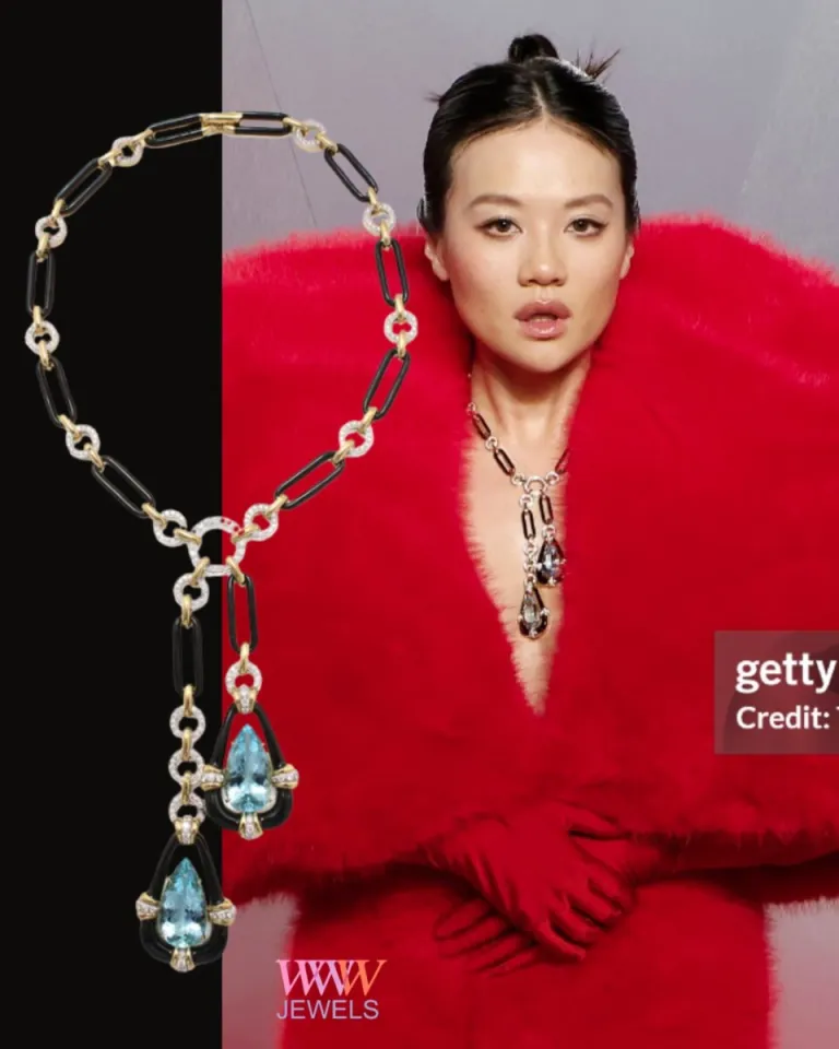 На Vanity Fair в меховом платье Quine Li и в ожерелье Paper Clip с двумя каплями гранированных аквамаринов (драгоценный камень из семейства бериллов) на чёрной эмали и украшенными бриллиантами.