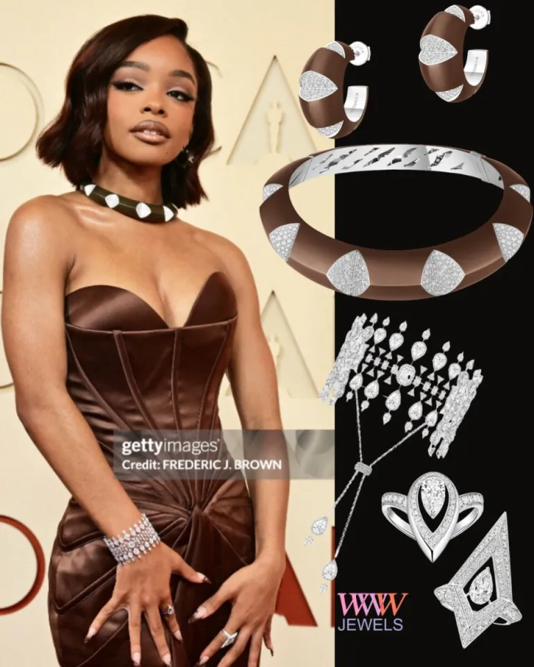 Ryan Destiny в сете из коллекции Chance бренда стала звездой вечера. Белое золото, бриллианты, чёрный оникс и гладкая чёрная эмаль, ожерелье, кольцо, браслет — каждый предмет острый и современный. В каждом изделии специально огранённые бриллианты Trillion. Геометрическая композиция оживает благодаря плавному взаимодействию отполированных краёв и структурной гармонии.