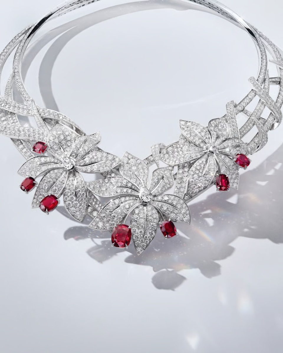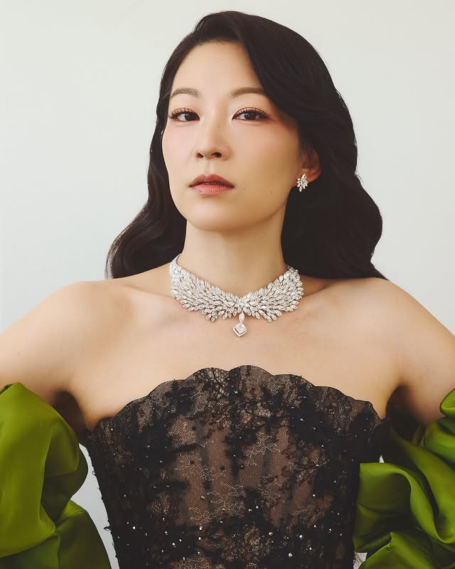 Maggie Kang в платье Philippe UTER и ожерелье Sword Lily от Chaumet. На изготовление колье из платины, бриллиантов и мозамбикских рубинов общим весом 14,03 карата ушло более чем 1500 часов. Коллекция «Ephemeral» — это мечты о мимолётном, нежном параде природы, длящемся всего мгновение. Здесь на первый план выходят цветы, такие как лилия, которые остаются в памяти долго после того, как угасают.