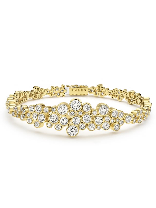 18K Gold Cluster Diamond Statement Bracelet price $44,000. Нежные пузырьки формируют смелые кластеры ярких бриллиантов из сияющего 18-каратного золота, формируя этот выразительный браслет. Её изысканный, роскошный дизайн делает его ярким и выразительным. Алмазы LAGOS — это натуральные камни высочайшего качества.