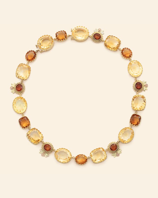 Модель Alma Jodorowsky в платье Jacquemus, ожерелье Pierreries citrines от Mellerio с цитрином стоимостью $65.637, вдохновлённое архивными украшениями, датируемые 1815-м годом, переосмысленных через вечную коллекцию Pierreries.