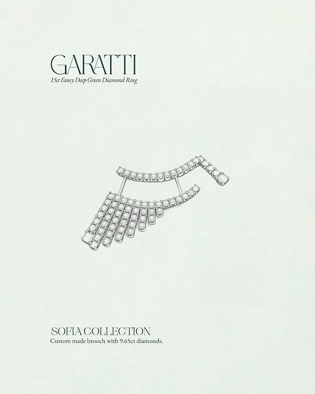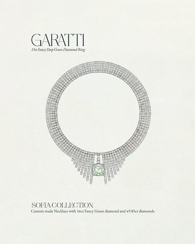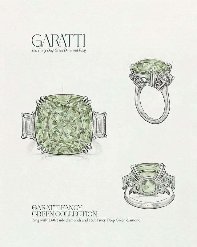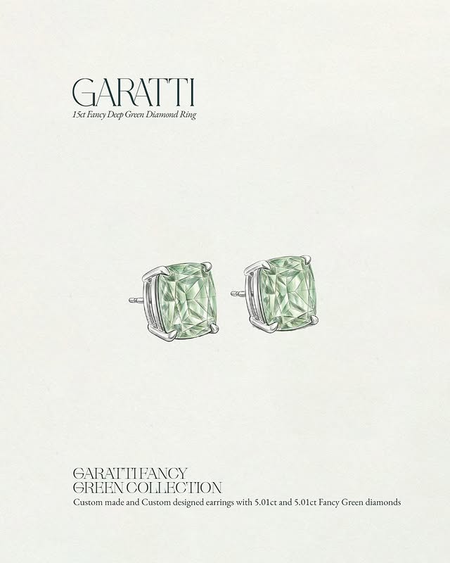 Кольцо Garatti с 15-каратным тёмно-зелёным бриллиантом, обрамлённым сияющими белыми бриллиантами, а также индивидуальные серьги, включая два 5,01-каратных изящных зелёных бриллиантов из коллекции Fancy Green Diamond.