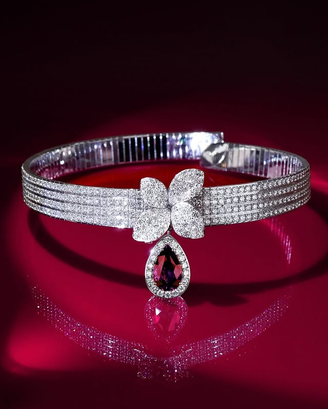 Единственная дочь индийского бизнесмена Isha Ambani в винтажном платье Valentino и редчайших розовых бриллиантах от Lorraine Schwartz. Это по-настоящему коллекционные камни, цена которых может превышать сотни миллионов долларов. Яркая бархатная лента с более 50 карат розовых бриллиантов — одного из самых редких цветов, в которых бриллианты могут встречаться естественно. Кольцо с синим бриллиантовым кольцом было поистине исключительным. Розовые, синие и белые бриллианты вместе образуют одну из самых редких цветовых комбинаций, которые вы когда-либо увидите на красной дорожке — каждый камень символизирует уникальное чудо природы, сформировавшееся глубоко внутри Земли на протяжении миллиардов лет. Подвешенные на бархате, бриллианты почти напоминали парящие созвездия света, превращая ожерелье в символ чистого высокого ювелирного искусства.