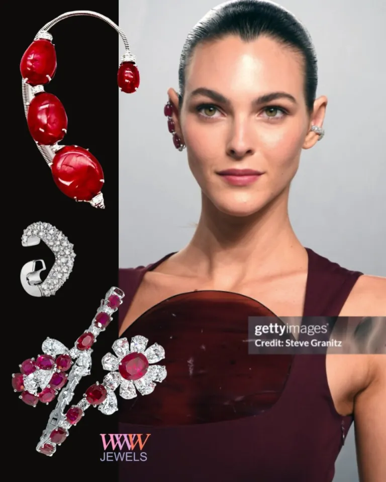На другом ухе был бриллиантовый Dyne Elixia Ear Cuff. На руке браслет ювелирного дома Moussaieff с 27,28k овальных и подушечных бирманских рубинов, из которых 18,04k — грушевых и круглых ромбов, украшенных 18-каратным белым золотом.
