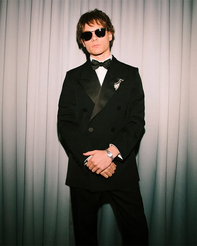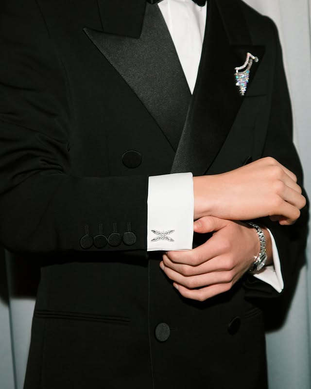 Американский актёр Mason Thames в индивидуальном наборе из броши с бриллиантами весом 9,65k и запонками с 4,80k бриллиантов из коллекции Universale с тонкими деталями.