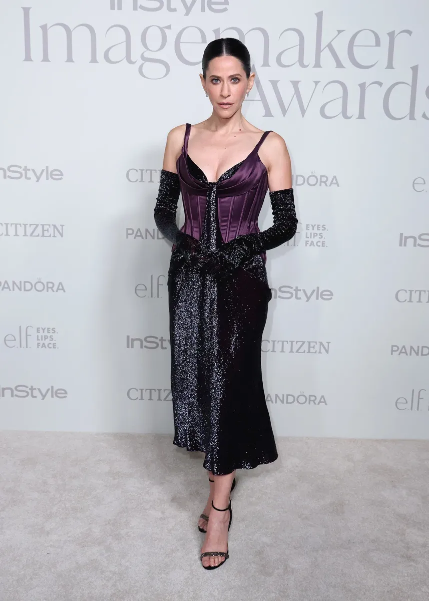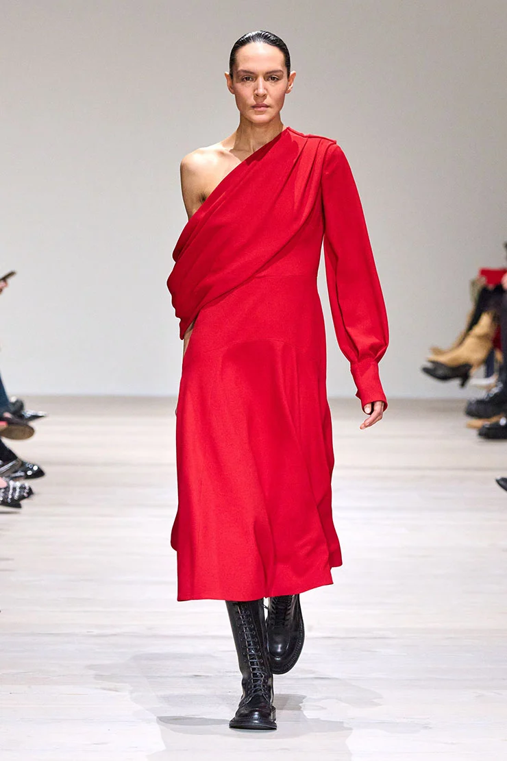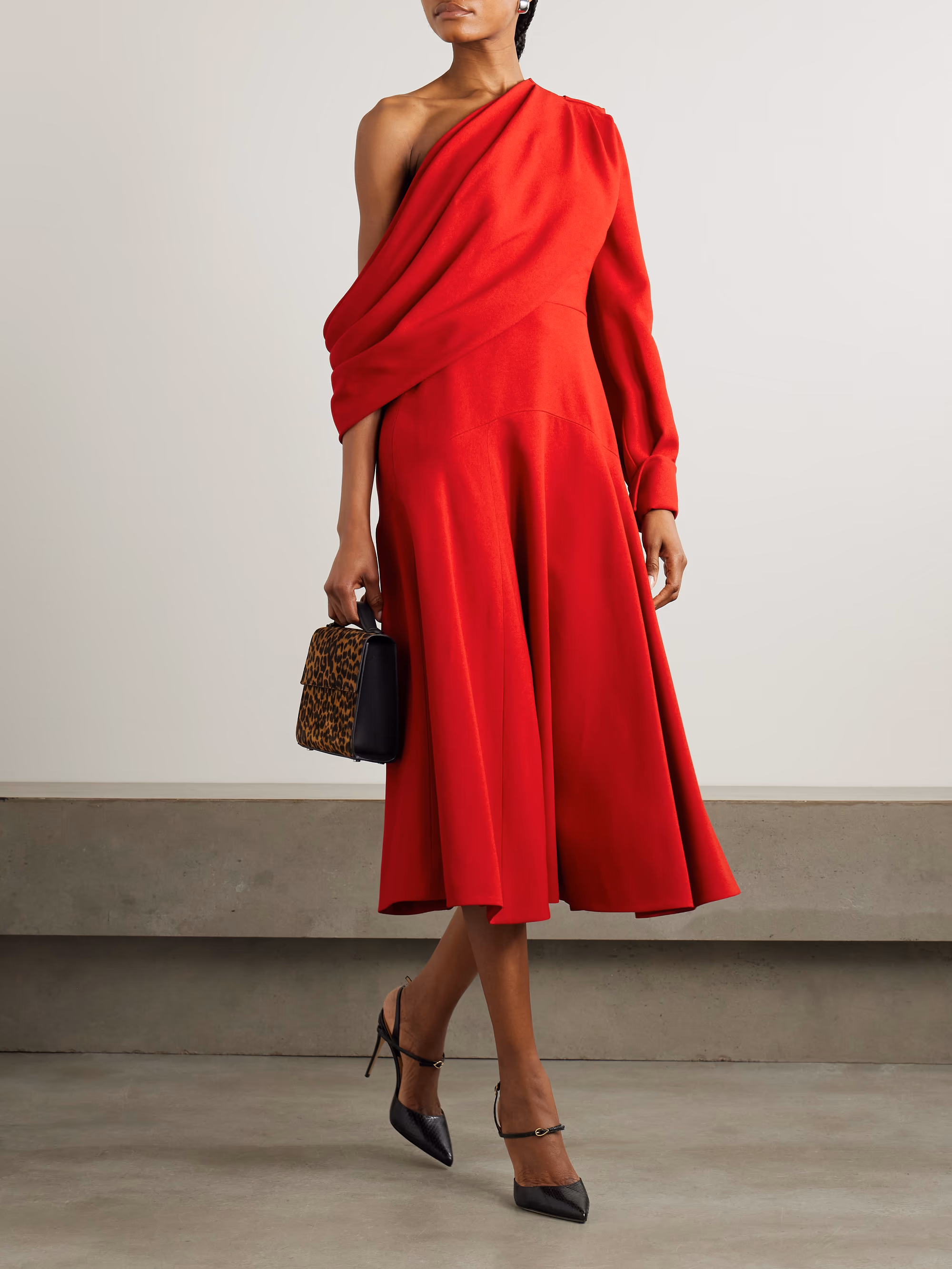 Laura Dern, получившая награду «Влиятельная женщина», надела драпированное платье миди Emilia Wickstead Sehima на одно плечо из креповой коллекции осени 2025 года. Это был стильный выход особенно в сочетании с подходящими красными туфлями-лодочками от Lesilla и украшениями от Mindy Mond, которые были тщательно подобраны Elizabeth Stewart и Jordan Grossman. Но смущают две вещи: рукав делает ее левую руку очень длинной, и создается впечатление, что она повредила правый локоть.