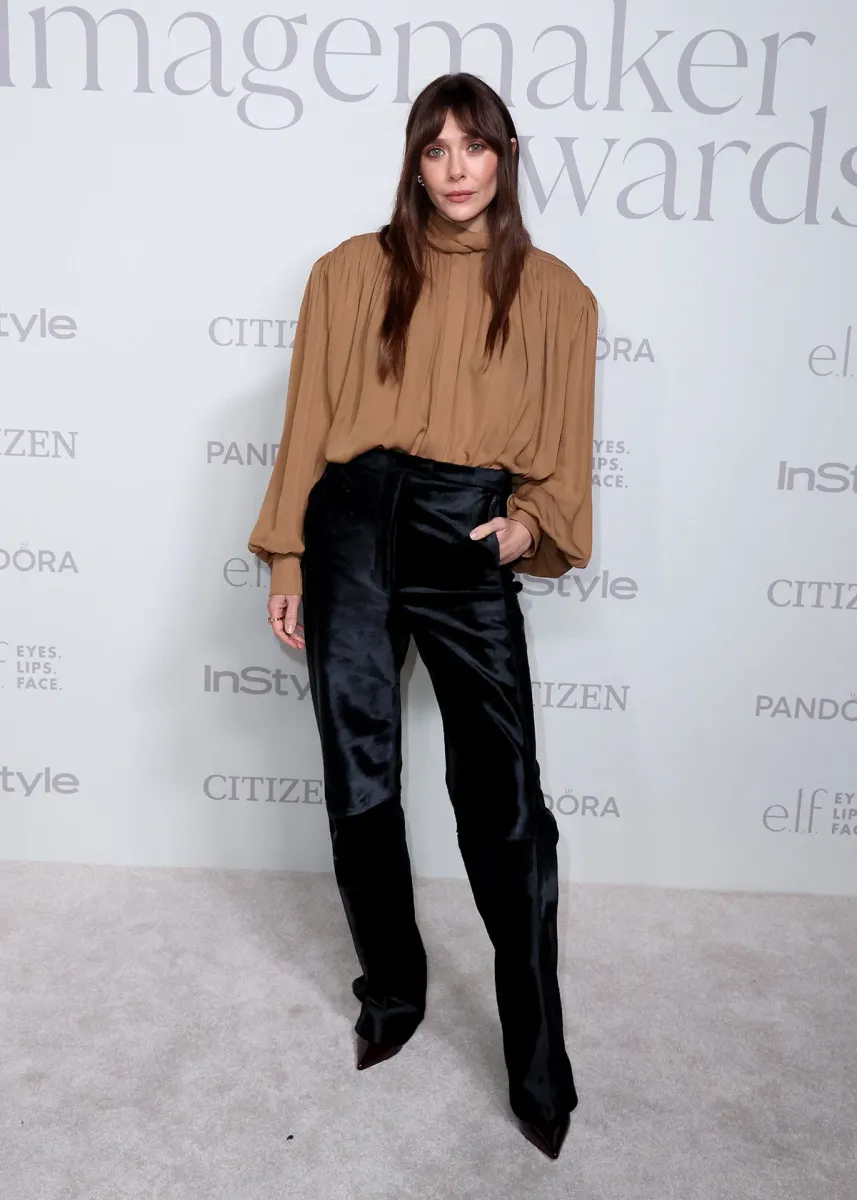Elizabeth Olsen в объёмной карамельной блузе с высоким горлом и чёрных атласных брюках из коллекции Khaite осень зима 2026. Тихая роскошь, где работают не бренд, а текстуры и посадка.