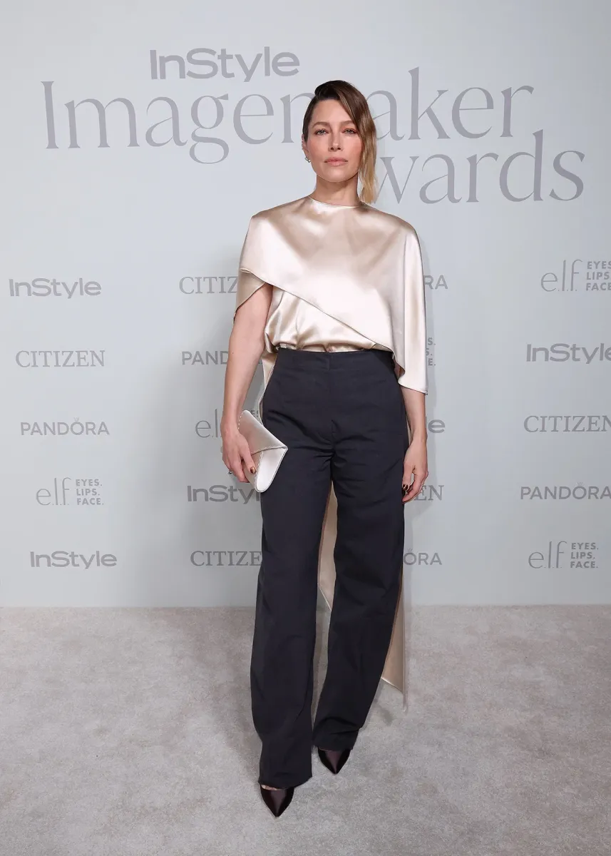 Для Jessica Biel этот был выход в двух половинках — потрясающем драпированном шелковом топе со шлейфом в пол цвета шампанского с асимметричным кроем в сочетании с серыми брюками, которые были слишком длинными. Образ точный, минималистичный, но с характером. Это стиль женщины, которая выбирает не внимание, а качество.