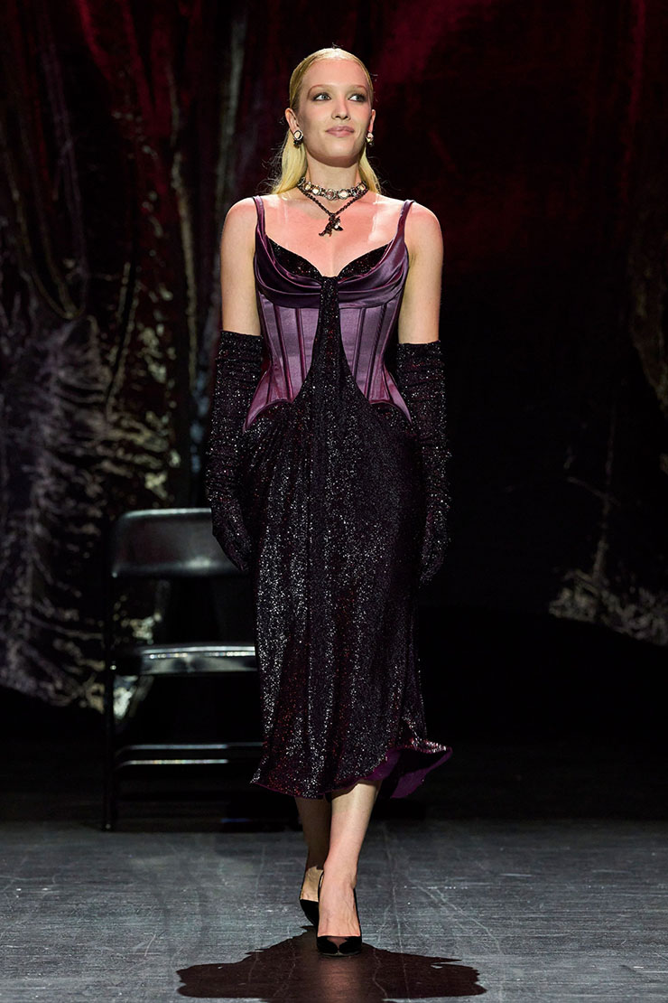 Джеки Тон была одета в мгновенно узнаваемый образ Wiederhoeft Spring 2024 со сливовым корсетом и черной блестящей юбкой, которая передала фирменную театральную чувственность лейбла. Коллекция называлась «Ночной ужас в опере» и была поделена на три «акта». Платье, которое выбрала актриса стало частью первого «акта», который назывался «Ночной террор». Образ однозначно смотрелся бы более стильно, если бы платье было в фактуре шелка. Но в СМИ эксперты отметили, что "Вы не можете просто надеть корсет и пару оперных перчаток на любое дерьмовое платье и назвать его официальным".