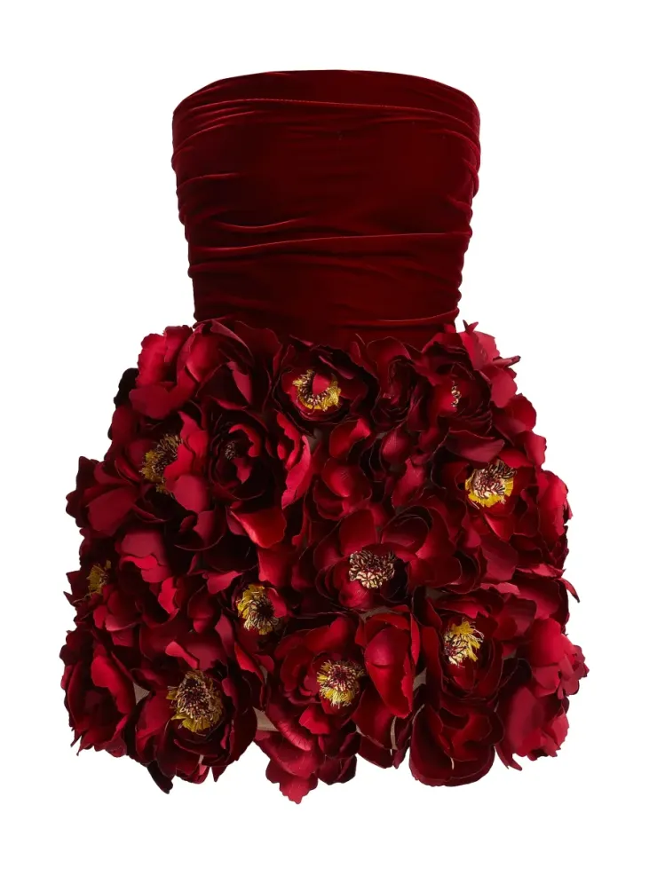 Это коктейльное платье от Oscar de la Renta имеет приталенный бархатный лиф и пышную юбку, выполненную из замысловатых 3D-пионов. Без бретелек. Цвет: Черная вишня. Застежка на молнию сзади. 100% нейлон, 98% хлопок/2% эластан. Подкладка: 100% шелк. Сделано в США. $12,590.