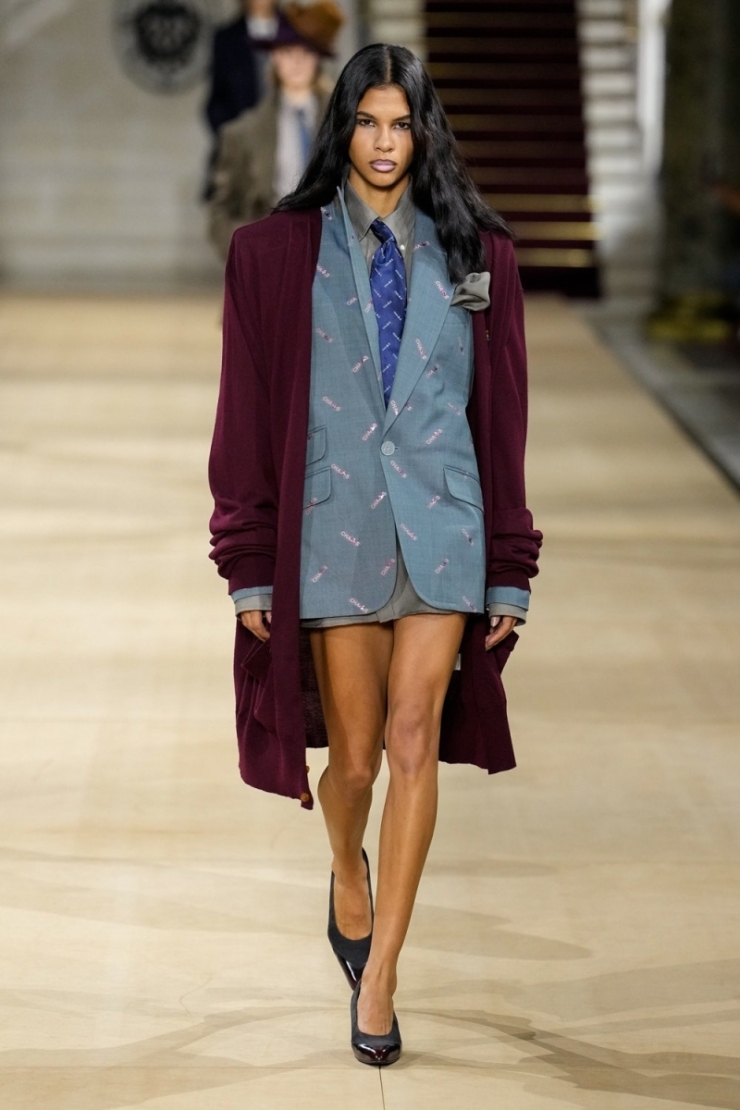 Julia Roberts в дизайнерском наряде с широкими штанинами с принтом и логотипом, который идеально сочетает в себе непочтительный дух Vivienne Westwood. Джулия Робертс еще раз доказала, почему она остается мастером нетрадиционного грандиозного выхода. Отказ от ожидаемого платья в пол в пользу мощного костюма является ее визитной карточкой, но этот образ — Andreas Kronthaler для коллекции Vivienne Westwood Fall 2025 — превратил концепцию в игривый, насыщенный узорами модный момент. Образ определяется его преувеличенным, плавным силуэтом. Грифельно-голубой пиджак, приталенный на талии и застегнутый на пуговицы, украшен тонким мотивом по всей поверхности, который придает серьезному пошиву дерзкий пост-панковский шарм. Брюки снизу представляют собой не что иное, как театральное заявление: строгий крой с широкими пропорциями, которые придают им драпировку и движение объемной юбки. Но гениальность именно такого образа кроется в деталях. Под блейзер Робертс надела подходящую рубашку с принтом и галстук, заколотый на узел двумя маленькими, богато украшенными винтажными брошами – довольно ловкий прием стилизации. Это действительно сильный, привлекательный образ. Этот штрих — отличительная черта великолепной неотшлифованной эстетики Westwood — наполняет корпоративную структуру костюма анархическим остроумием, гарантируя, что это будет что угодно, но не стандартный деловой костюм. Ее медные волосы уложены легкими, струящимися волнами, контрастирующими с точной геометрией наряда. Образ дополняют гламур высокой моды потрясающие серьги-подвески Sabyasachi с аквамарином и бриллиантами. Это просчитанный и сложный выбор стиля, который укрепляет статус Робертс как одной из самых захватывающих популярных знаменитостей, за которыми стоит наблюдать, когда дело доходит до стиля знаменитостей.