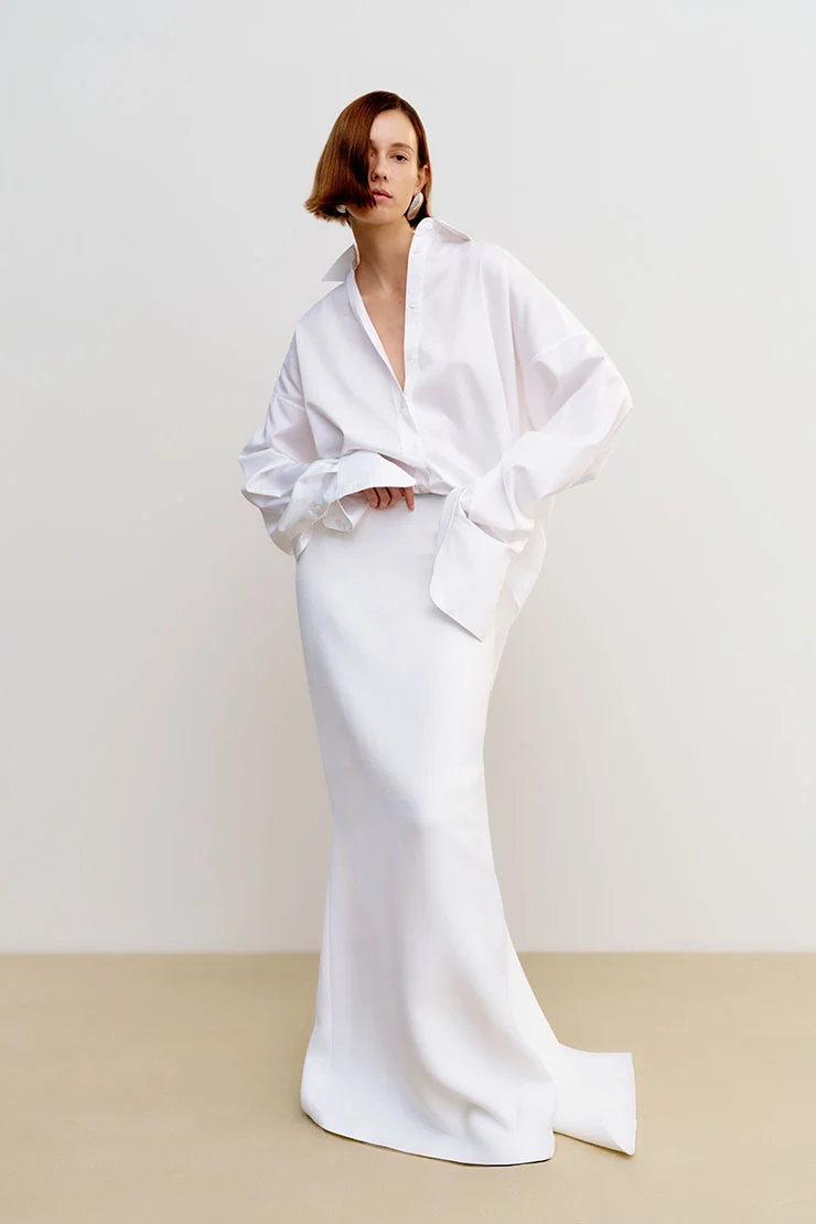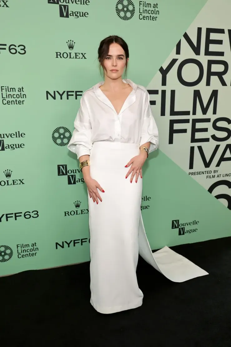 Zoey Deutch в Brandon Maxwell Resort 2026 показала мастер-класс по минималистскому гламуру. Белоснежная рубашка со струящейся юбкой и шлейфом излучали спокойную уверенность. Образ получился чистый, острый и освежающе непритязательный. Этот выход, украшенный серьгами-гвоздиками Tiffany & Co. с бриллиантами и браслетами-каффами Elsa Peretti® Bone показал элегантную современность.