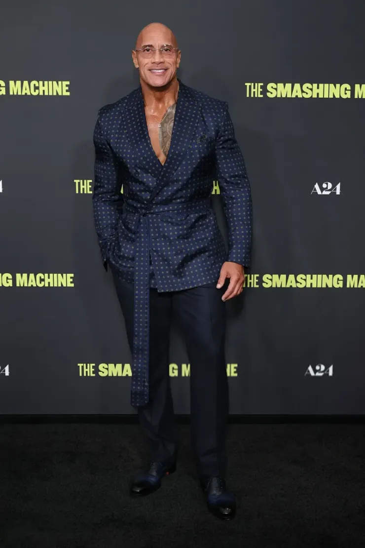 Dwayne Johnson нашел свою золотую середину в Dunhill, особенно в их двубортных вечерних пиджаках. Этот элегантный темно-синий образ с шелковым принтом из коллекции осени 2025 года был выполнен с настоящей утонченностью: нагрудный платок с цветочным принтом, темно-синие туфли Santoni, часы Chopard L.U.C Heritage Grand Cru, а также ожерелье и кольца Chopard Happy Diamonds. Кажется, что пояс слишком длинный и плохо завязан (мы не ожидаем банта, но стилист мог придумать более интересное, чем узел халата), но все равно образ получился великолепно стильный и сексуальный. Если отсутствие рубашек является неотъемлемым компонентом публичного стиля, то имеет смысл превратить халаты в официальную одежду.