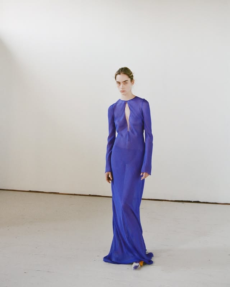 Greta Lee в сногсшибательном ультрафиолетовое платье из коллекции Colleen Allen Spring Summer 2026. Грета выбрала мягкость: плавные линии, романтическую драпировку и непринужденную легкость, с дерзким большим вырезом в виде замочной скважины вдоль груди. Ли присоединилась к тенденции голых платьев. Выбранный здесь шелк достаточно прозрачный, чтобы сделать цвет по-настоящему женственным и мечтательным, а не сверкающим сапфировым, но на некоторых фотографиях он выглядит почти как шелковый шармез. Это платье было сшито на заказ для Греты, поэтому длинные рукава сделаны намеренно.