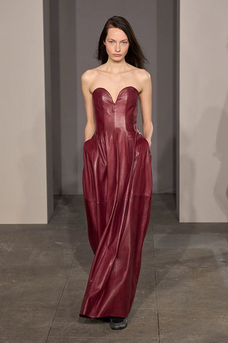 Rebecca Ferguson в черном кожаном платье Simkhai без бретелек. Этот образ знаменитости является мощным заявлением, которое сочетает в себе классический гламур красной дорожки с отчетливой, острой текстурой, сразу же отличая его от традиционных вариантов тканей. Ее выбор дизайнерского наряда определяет пересечение смелого материала и неподвластного времени силуэта, обеспечивая сильный модный момент для списка знаменитостей. Платье имеет эффектный силуэт в полный рост с вырезом в форме сердца без бретелек. Лиф плотно структурирован, напоминая корсет или бюстье, прежде чем уступить место объемной юбке, которая ниспадает на пол. Намеренные складки и то, как ткань держит форму, предполагают основную структуру или жесткую подкладку, классифицируя ее как эффектный, скульптурный архетип платья от кутюр. Глубина юбки подчеркивается тем, что кажется скрытыми боковыми карманами, добавляющими тонкий штрих современности. Самым ярким элементом является использование матовой черной кожи или высококачественного материала под кожу. Такой выбор ткани привносит ощутимое ощущение мощной одежды и серьезности, контрастируя с типично мягким, струящимся текстилем красной ковровой дорожки. Кожа придает платью вес и тактильное присутствие, в результате чего получается темная, внушительная эстетика, которая противостоит свету и подчеркивает тень. Стиль Фергюсон минимален, что позволяет доминировать текстуре и структуре дизайнерского наряда. Отсутствие заметного колье или заметных сережек обеспечивает лаконичный акцент на ее чистом декольте. Простой стиль Ребекки и минимализм дали «тихую готскую» энергию.