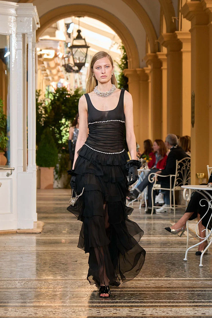 Riley Keough в платье из круизной коллекции Chanel 2026. Платье было выполнено из полупрозрачной ткани с мерцающими украшениями со стразами на линии груди и чуть ниже талии, что резко контрастировало с черной тканью. Юбка отличалась многоярусными оборками, добавляющими женственную изюминку общему наряду и струящимся элементом.