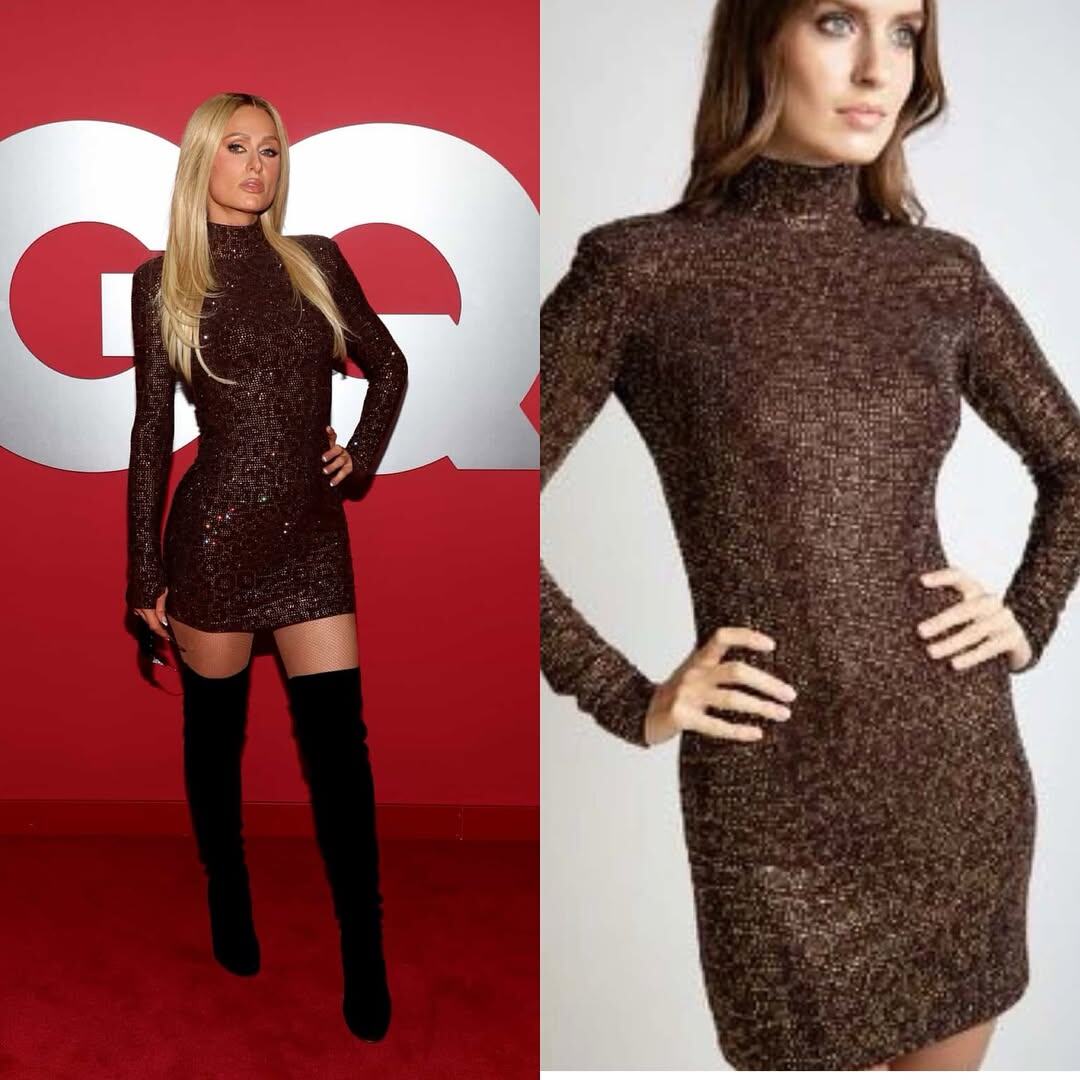 Paris Hilton в коричневом платье Solangel с длинным рукавом, с леопардовым принтом, украшенным драгоценностям, который сверкал с каждым поворотом. Она сочетала своё платье с чёрными солнцезащитными очками и замшевыми сапогами Gianvito Rossi.