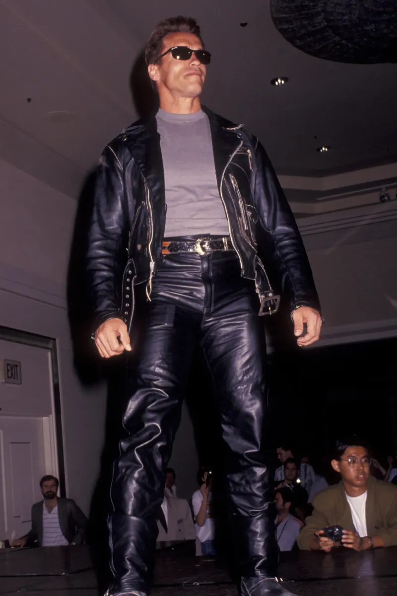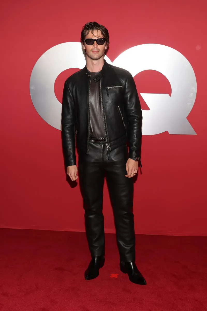 Patrick Schwarzenegger вышел в тяжёлой кожаной байкерской куртке, кожаных брюках Tom Ford от Haider Ackermann, кубинских ботинках на каблуке и очках Wayfarer и сделал аккуратную отсылку к промо-образам своего отца времён «Терминатор 2: Судный день» в 1991 году.