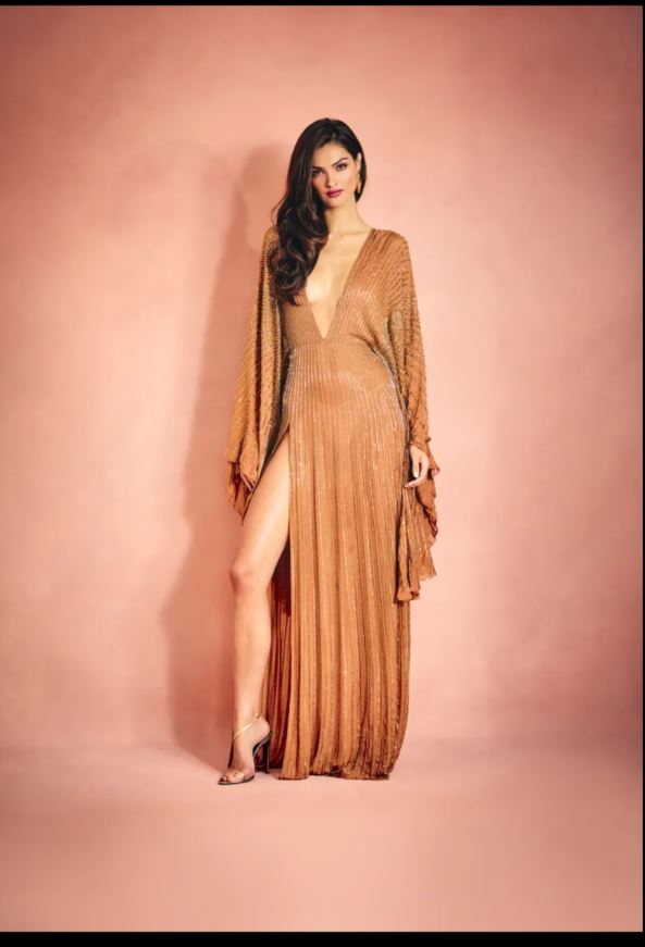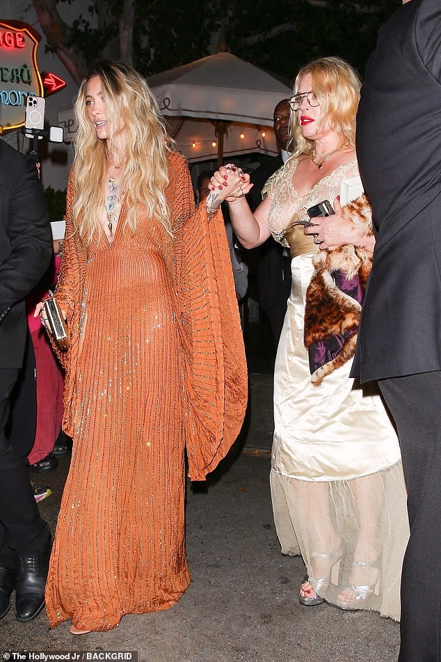 Paris Jackson в платье Retrofête Spring 2025 в стиле бохо с глубоким декольте, разрезом до бедра с нежным мерцанием.