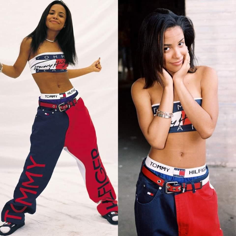 Вообще от стиля 90х ничего. Шмот-да, оттуда, из кладовок, но по стилю-все мимо. Разве что Хилфигер топ и джинсы. В моем понимании "в стиле 80, 90 и т.д.", это все выдержано: от одежды до аксессуаров, прически, обувь. А просто нарядиться в древгий костюм, это не в стиле. Про Пэрис и писать нечего, она в  90-00 по жизни😄