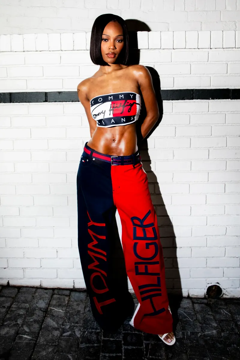 Quenlin Blackwell вышла с тройкой премиальных архивных образов. Перед шоу она позаимствовала наряд из архивов Hilfiger из красно-бело-синего топа Tommy Hilfiger и широких джинсах, которые в 1997 году носила покойная певица Aaliyah.