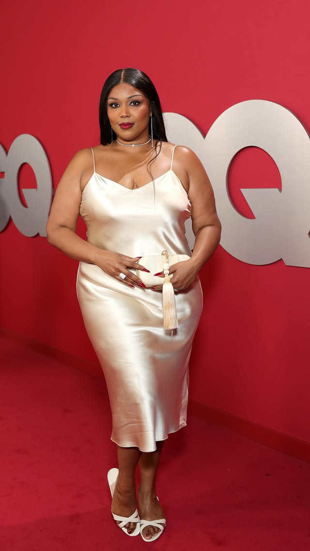 Lizzo в платье-комбинации цвета слоновой кости Ralph Lauren. Чистый, непритязательный и, честно говоря, освежающий и максимально легкий образ.