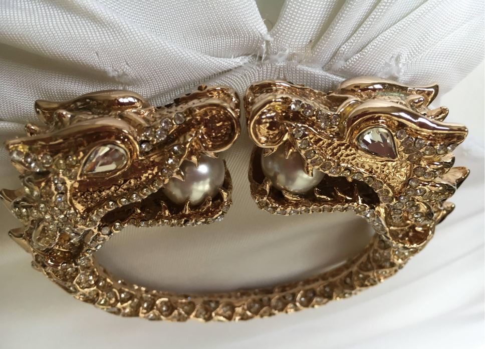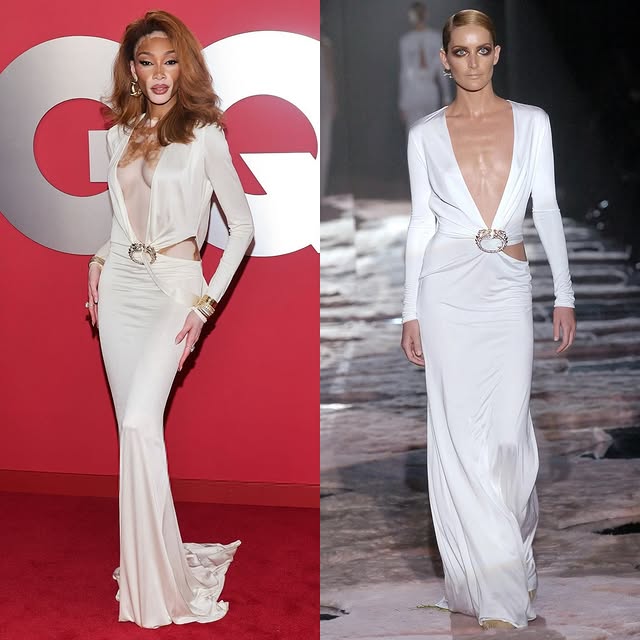 Winnie Harlow в архивном платье из коллекции Tom Ford для Gucci 2004 - это своего рода отсылка к 90-м годам. Глубокий вырез, собранная талия, облегающий кремовый трикотаж и пряжка в виде золотых драконов -  вот винтажная сексуальная привлекательность, выполненная с изяществом.