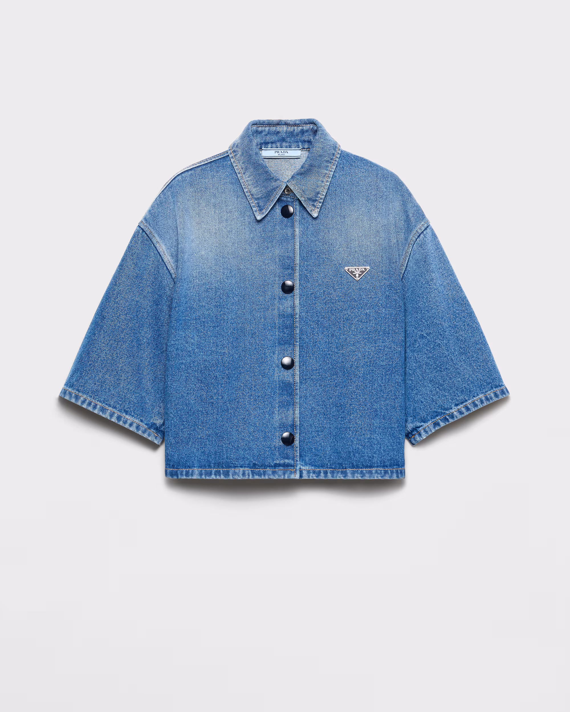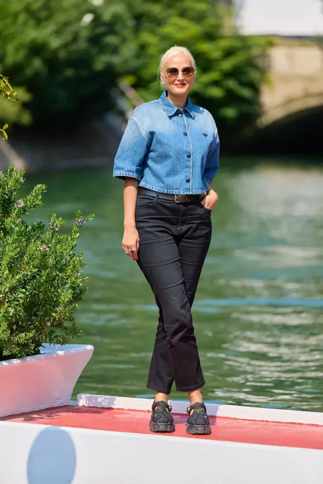 Амбассадор Prada и член жюри Julia Ducournau в укороченной джинсовой рубашке Prada и черных брюках — непритязательной, функциональной и очень «режиссерской».