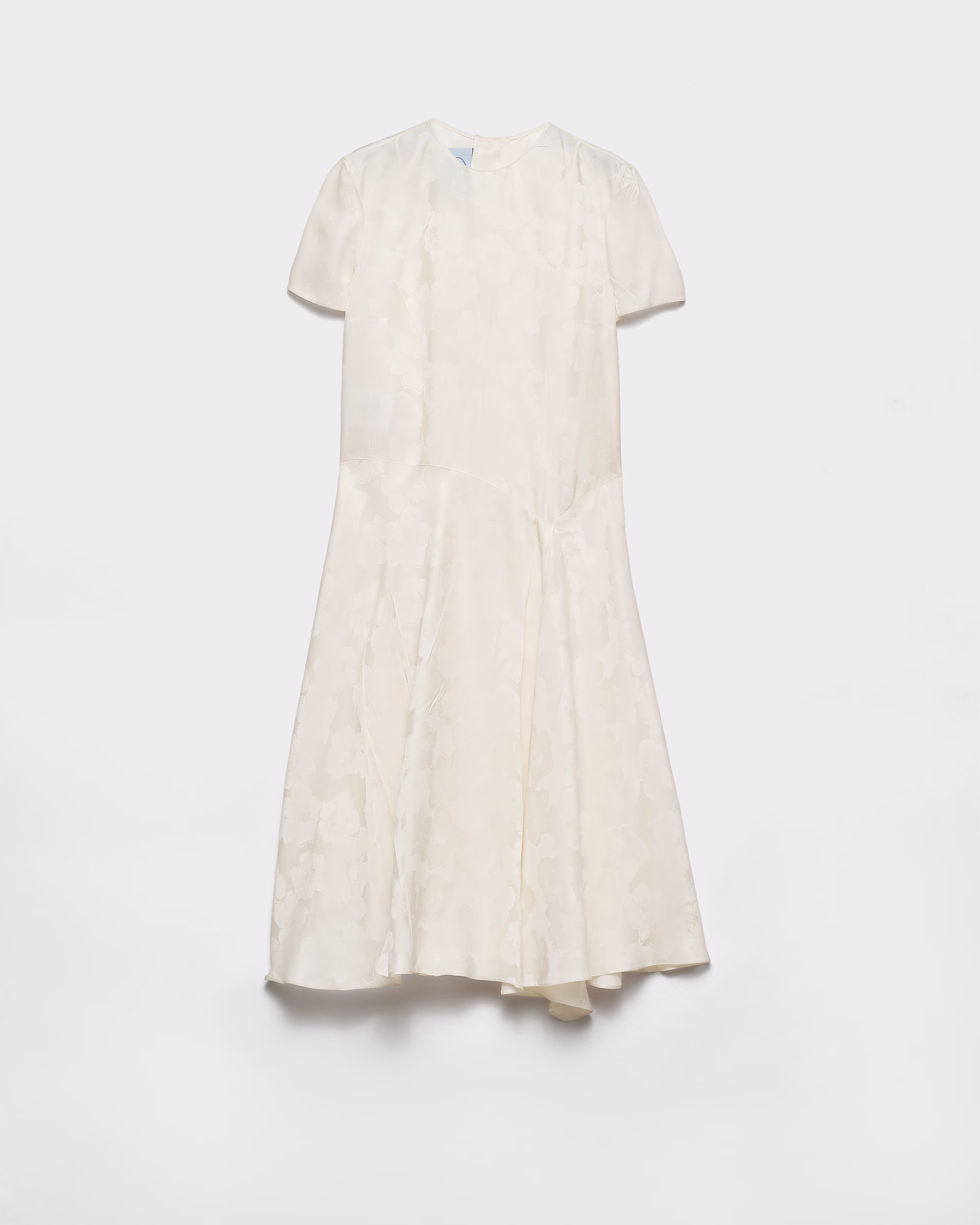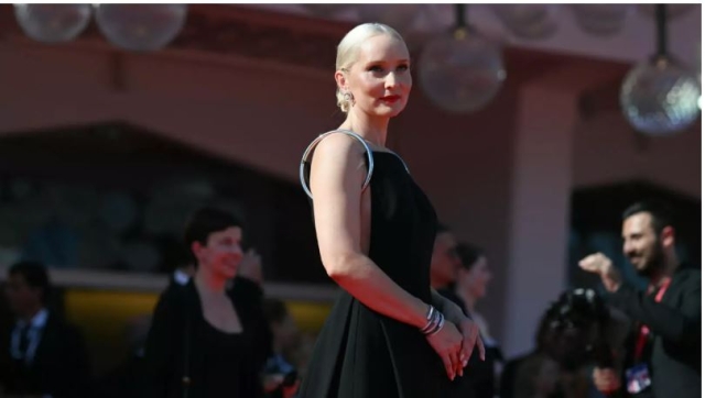 Для своего первого официального фотосесета Julia Ducournau переключилась на летний режим, надев жаккардовое платье Prada с принтом цвета слоновой кости и серебристые кожаные босоножки. Он был легким, игривым и казался идеальным для солнечного венецианского дня.