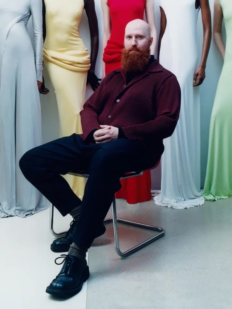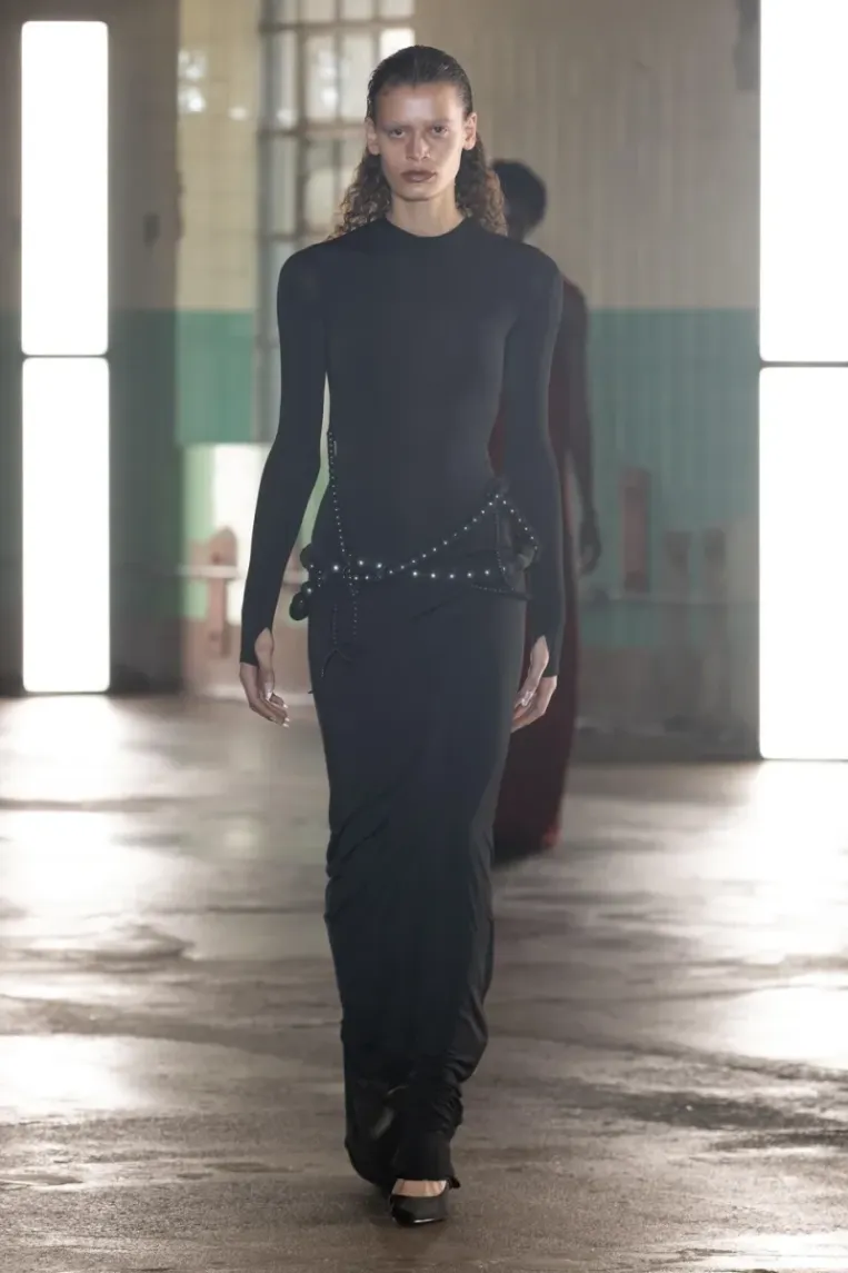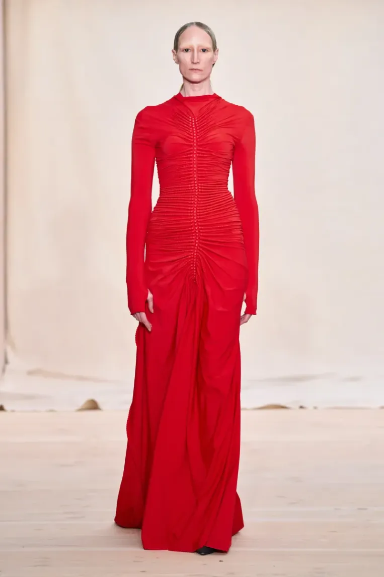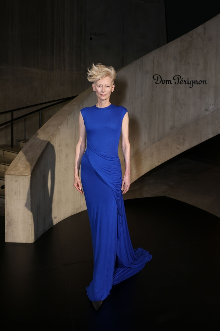 На церемонии вручения премии Governors Awards 2024 года. Образ в ярком красном платье из коллекции Standing Ground Spring 2025 был впечатляющим. Платье, разработанное Michael Stewart Dunne, доказывает, почему он стал лауреатом премии LVMH в том году. Известный созданием современных изделий, адаптированных к уникальной форме тела, мастерство Dunne здесь очевидно. Статное присутствие Тильды усиливается, а драпировка создает иллюзию неожиданного силуэта песочных часов. Ее выбор аксессуаров позволил сделать акцент на платье: серебряные туфли-лодочки добавили нежный блеск, а красные губы связали весь образ воедино.
