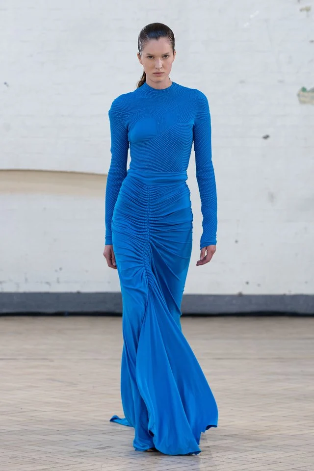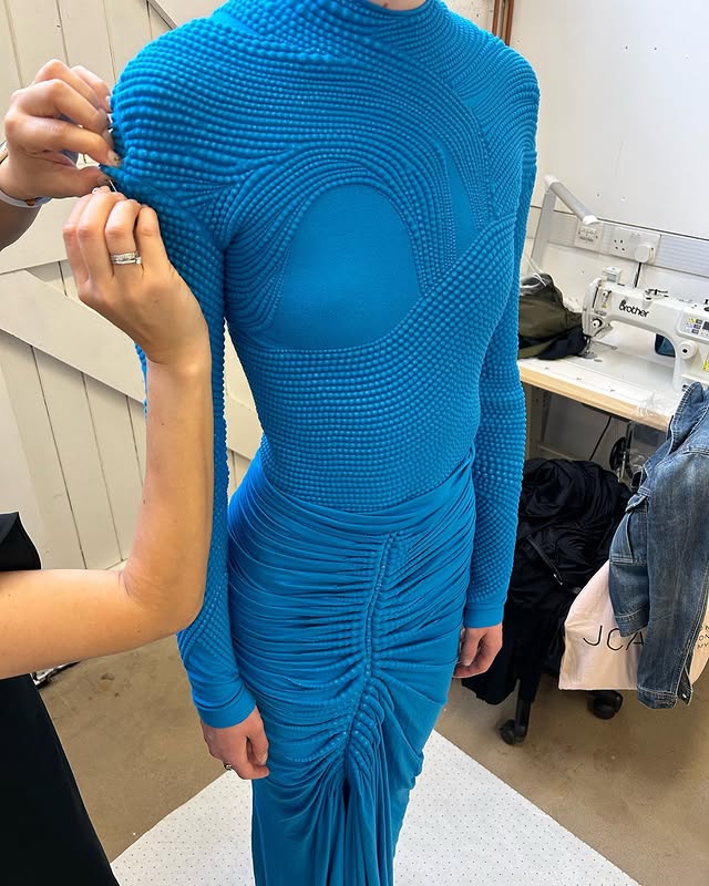 На ужине Moët Hennessy Dom Pérignon. В драпированном платье цвета электрик Spring 2024. То, как оно извивается и изгибается вокруг ее тела, придает ей плавную силу и неожиданную мягкость. Это минимализм с движением. И этот яркий синий цвет такой насыщенный и завораживающий на ее фарфоровой коже, в то же время царственный, но футуристичный. Туфли-лодочки Manolo Blahnik и ее фирменная прическа придавали образу необычность.